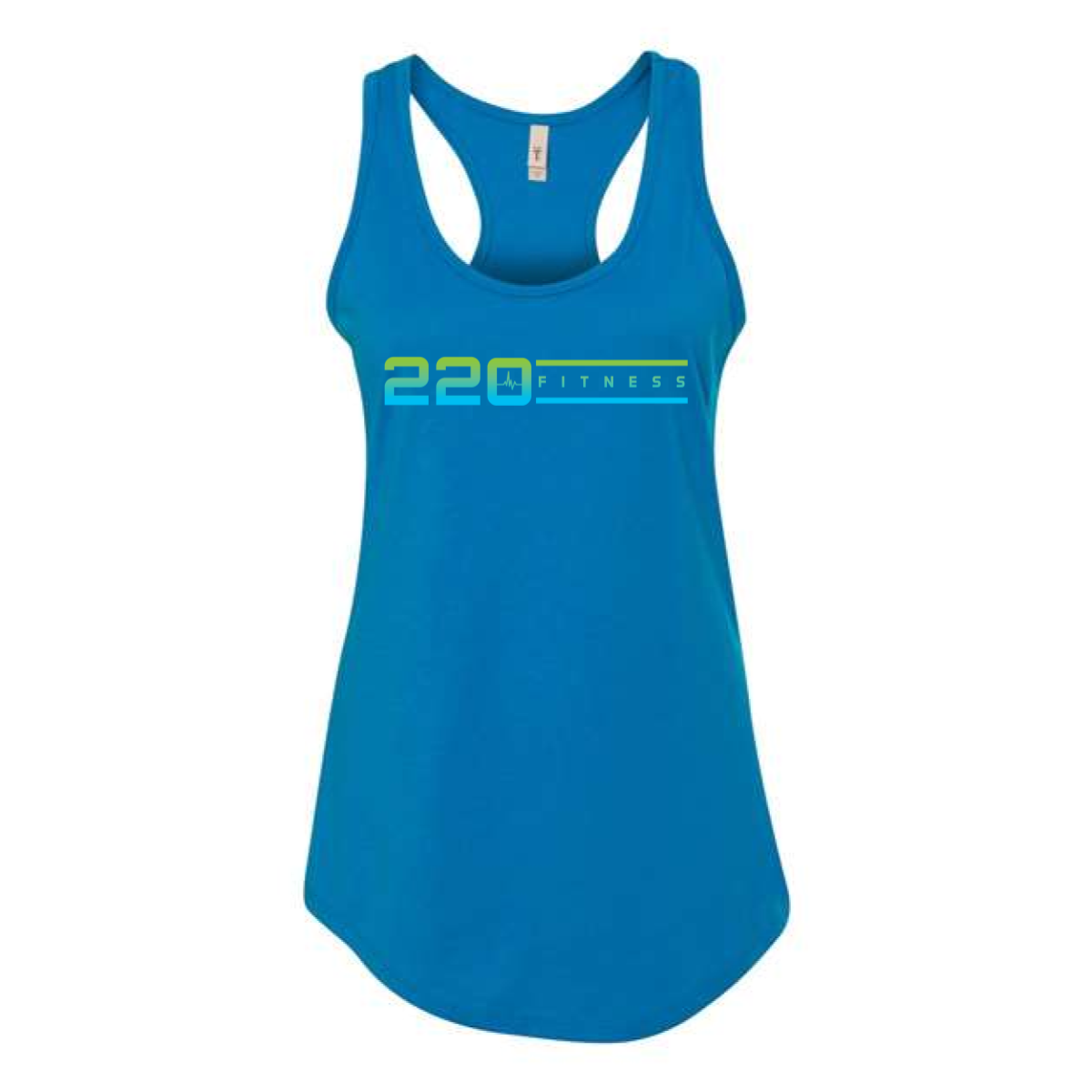 We chose a bright blue racerback tank for a strong summer look. The front design featured a sleek 220 Fitness logo with a smooth gradient effect. Thin line details gave it a modern and athletic feel. Light green and blue ink created contrast without being too loud. The print was placed centered on the chest.