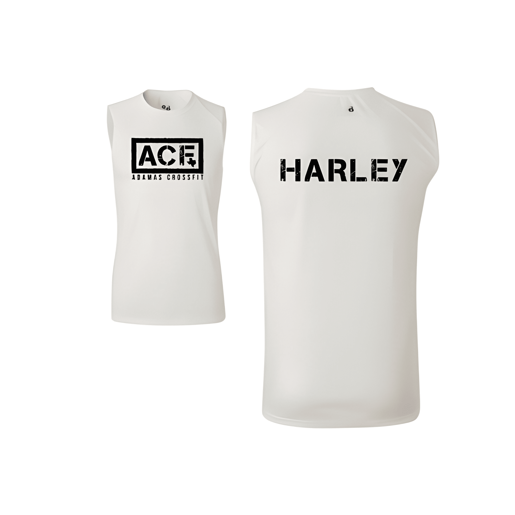 We placed Ace bold above the Adamas CrossFit name with Harley locked in for a clean athlete driven look. The tee was chosen for its comfortable fit and competition ready feel. Centered chest placement keeps the name front and center.