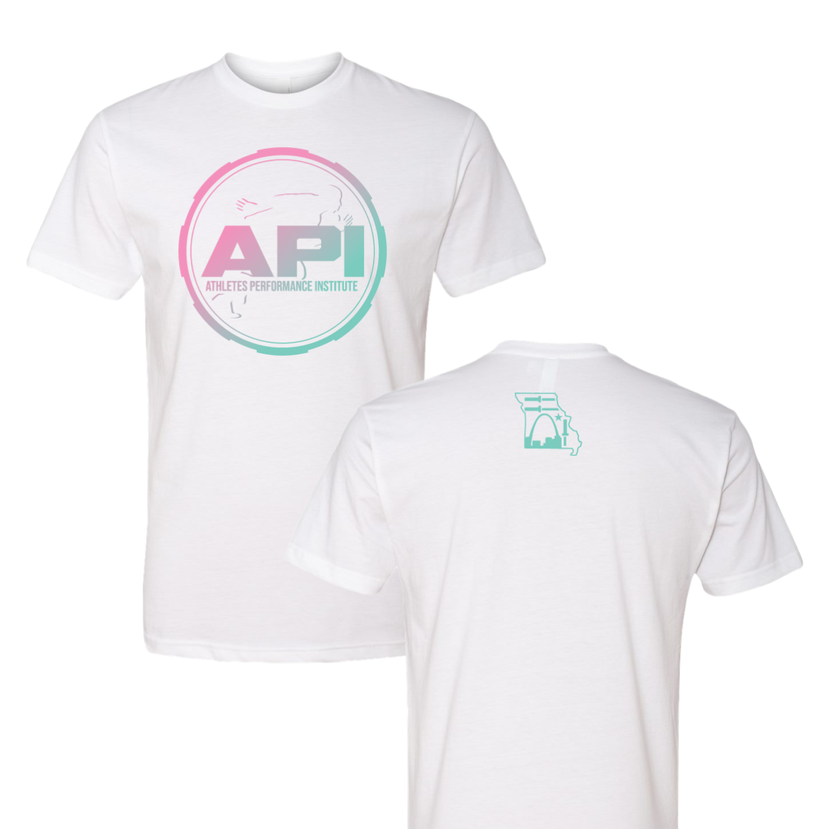 We used a white tee to let the gradient design stand out. The front featured a circular badge with a runner and bold API lettering. A pink to teal fade added movement and energy without being too loud. The back included a small location mark for added identity. The print used both front and back placement to complete the design.