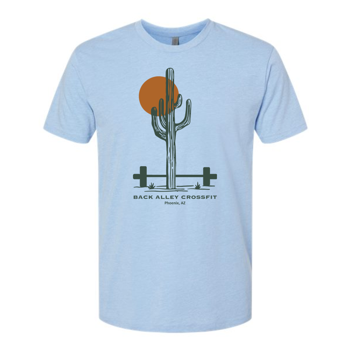 We used a light blue tee to match a soft spring feel. The design showed a tall cactus with a barbell behind it. A warm sun shape added contrast and depth. The front print was centered to keep the layout balanced. The style felt local and tied to Phoenix.
