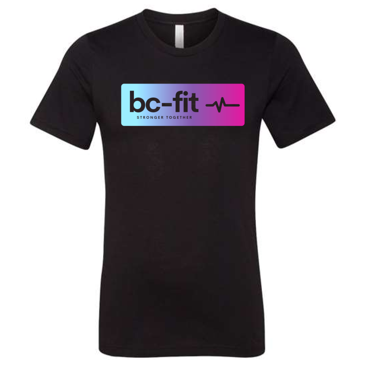 We used a black tee to make the design stand out. The front featured a bold bc-fit logo inside a soft gradient block. The color fade moved from blue to pink for a modern feel. A small heartbeat line added motion and energy. The print was centered on the chest for a clean layout.