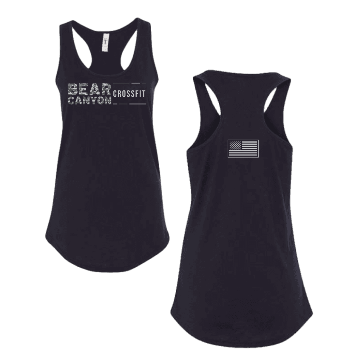 We used a black racerback tank for a light and athletic fit. The front design used a distressed BEAR CANYON wordmark with CROSSFIT aligned to the side. The layout stayed left chest to keep it subtle and clean. The back added a small American flag for extra detail. The print used both front and back placement for balance.