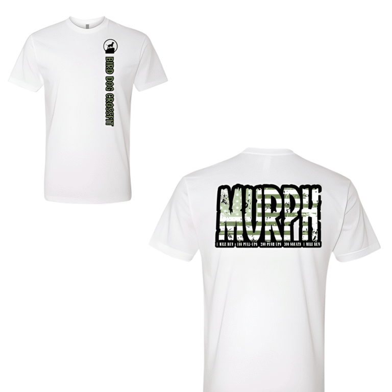 The back centers a large MURPH wordmark filled with a sage green camo flag pattern and outlined in bold black, with the full workout rep count in small type below. Everything is printed on a white tee, which keeps the camo fill bright and readable. The front runs the gym logo and name vertically down the left chest in olive and black — a clean alternative to the standard chest hit.
