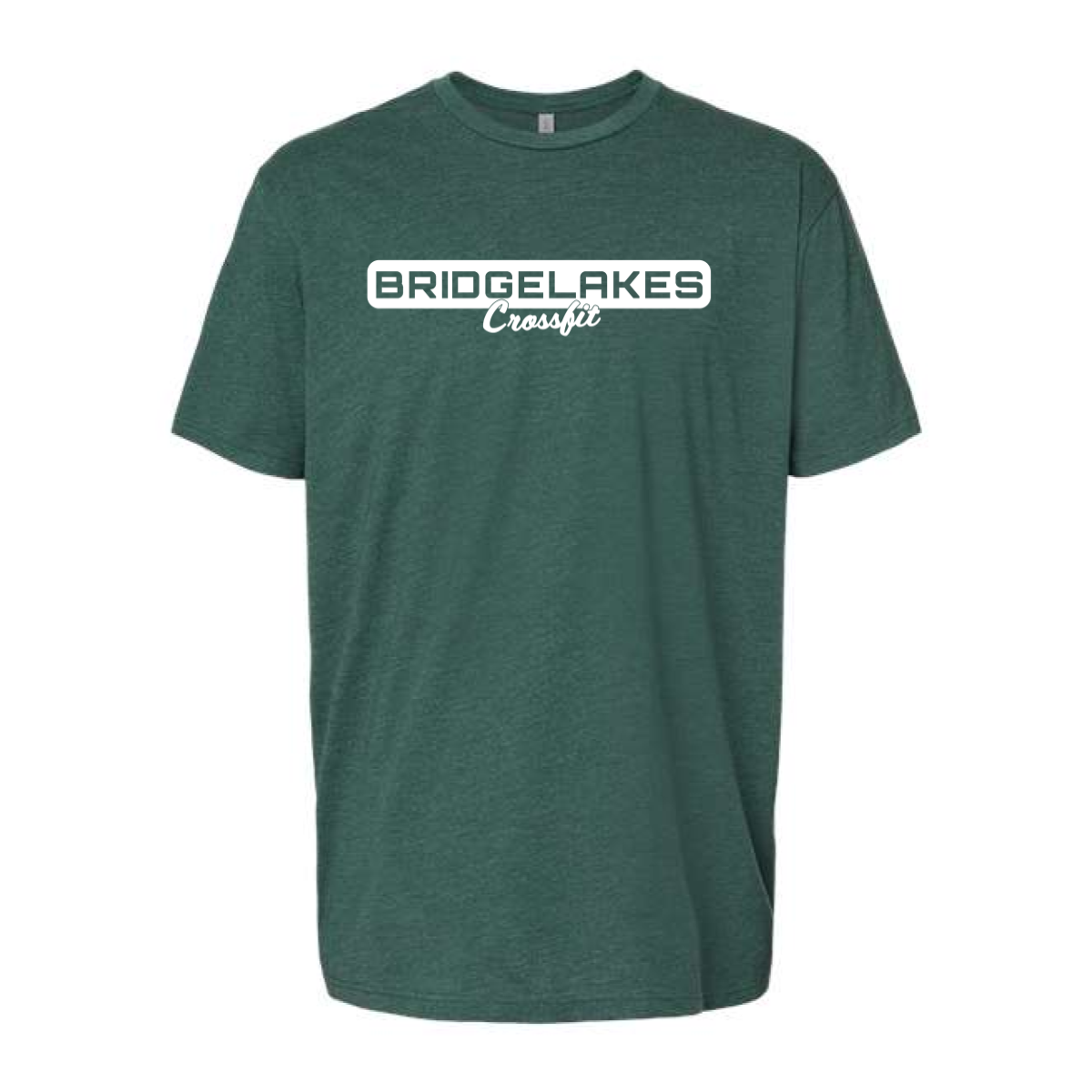 We used a heather green tee for a soft and natural look. The front featured a simple Bridgelakes CrossFit lockup in white. The rounded badge style gave it a polished feel. The print sat centered across the chest. The design stayed minimal and strong.