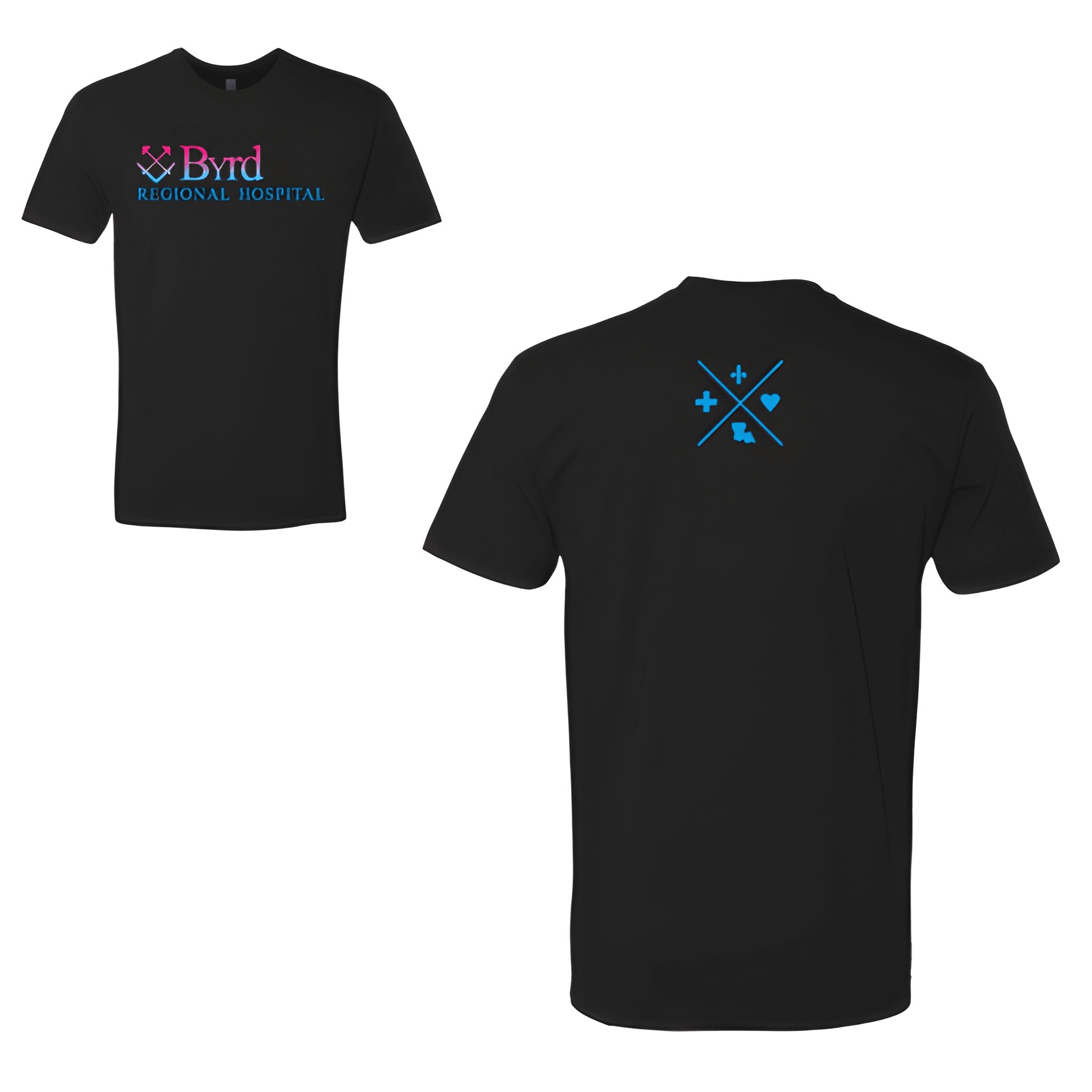 We placed Byrd bold above Regional Hospital in a clean stacked layout. The tee was chosen for its comfortable fit and long shift durability. Centered chest placement keeps the name front and center.