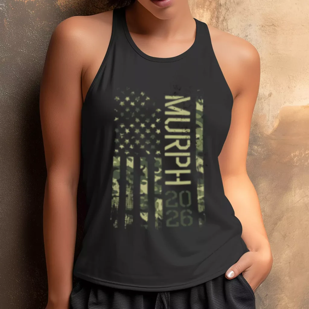 The camo flag is a fresh take on a familiar shape and it works because it commits completely — there is no red or blue anywhere to break the theme. On a black tank the camo reads dark and tactical, which fits Murph better than most designs that lean celebratory. These Murph tshirts are built for people who treat the day as a duty, not a party. The racerback cut keeps everything functional when the actual work starts.