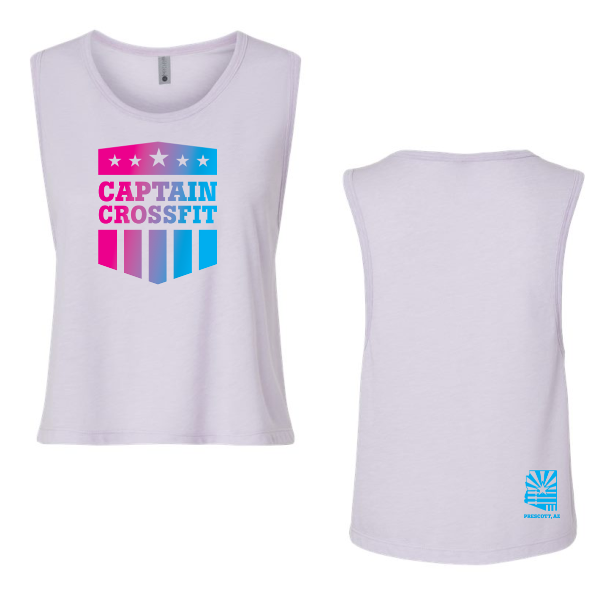 We used a light tank for a soft and breathable base. The front design featured a shield with stars and a pink to blue gradient for strong contrast. Captain CrossFit sat centered inside the shape for a clean read. A small Prescott AZ hit was added on the lower back for detail. The layout felt balanced and modern.