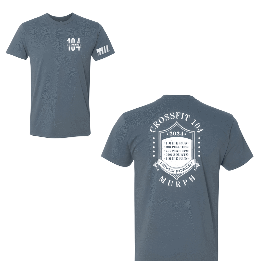 CrossFit 104: Murph The Shield Murph asks a lot. This shirt asks you to remember why. Overview The back centers a military shield framed in stars, with the full Murph workout listed inside and “Never Forget” on a banner below. “CrossFit 104” arcs across the top and “Murph” anchors the bottom in heavy type. Everything […]
