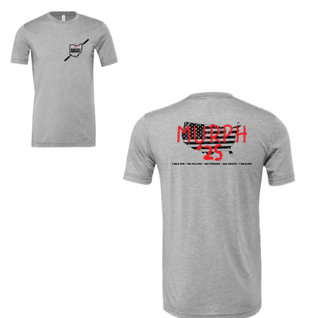 Glass City CrossFit: Murph Red Graffiti Flag Every Memorial Day, Glass City CrossFit shows up for Murph. This shirt shows up with them. Overview Printed on a heather grey crew neck tee, the back features a distressed American flag shaped as the continental U.S. with “MURPH” in bold red graffiti lettering and “’25” beneath it. […]