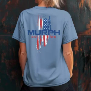 Printed in olive camo on a black tee. The front centers "MURPH" in large block lettering filled with a camo pattern, with the gym name above in small spaced caps and "2 0 [flag] 2 4" below — the zero swapped for a small American flag icon. The back carries a minimal boxed "C" logo on the left chest in olive outline. Black and olive keep it clean and direct.