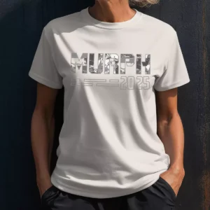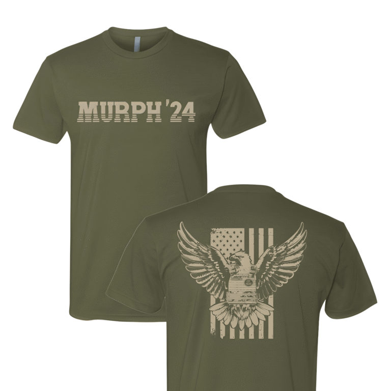Printed in warm sand ink on a military green tee, the palette pulls straight from field gear. The front carries "MURPH '24" in a bold stripe-cut condensed font that reads more stencil than serif. The back is the statement: a detailed bald eagle with wings fully spread, layered over a distressed American flag. The oversized back graphic fills the shirt the way a patch fills a uniform. Standard front chest placement keeps it clean while the full back print does the heavy lifting.