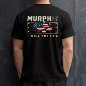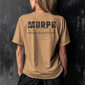 Printed in warm sand ink on a classic navy tee, the back features a bold distressed "MURPH 25" treatment with a spread eagle clutching an American shield and a "God Bless America" banner beneath it. The patriotic Americana style suits the navy garment perfectly — the ink reads almost like weathered brass, which gives it real weight. Workout stats run across the top of the back in small caps. The front keeps it clean with a lion logo chest print and a flag sleeve hit.