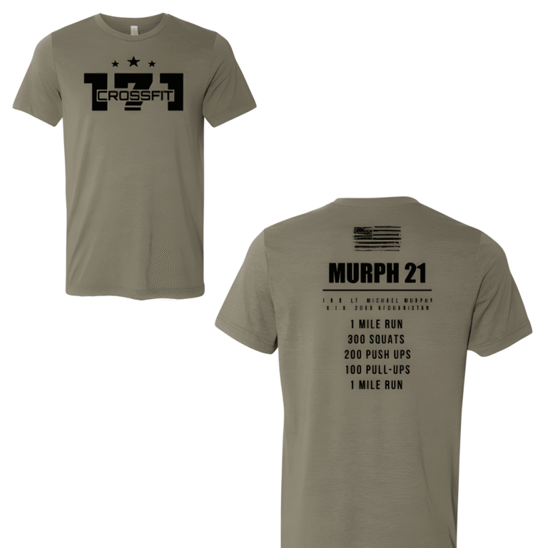 Printed in full black ink on a military olive tri-blend tee, the front runs the gym's "171" mark in thick block numerals with "CROSSFIT" locked inside the negative space, topped with three stars. The back carries a worn distressed flag at the neck, "MURPH 21" in heavy condensed type, the dedication line to Lt. Michael Murphy, and the full workout list stacked clean below it. Tone on tone from front to back. Nothing extra.