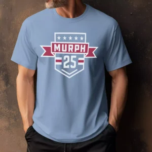 The front centers the gym's numeral logo with the American flag printed inside it — stars in the canton, red and white stripes filling the body of the mark. Three white stars arc above it. "CrossFit" runs clean across the middle in white. The back is minimal: "MURPH" in bold stencil type with the year split on either side. Everything is printed in red, white, and blue on a heather light blue tee — a smart garment color choice that lets the patriotic palette breathe without looking overdone.