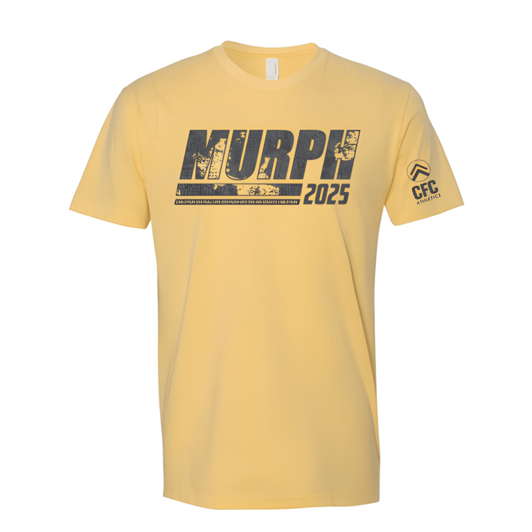 Printed in charcoal gray ink on a soft butter yellow tee, the front leads with "MURPH" in oversized distressed block letters that fill the chest. The weathered texture inside the lettering gives it a worn in, well earned look. "2025" anchors the design below, framed by two horizontal rule lines with the full workout rep count running underneath in small caps. The CFC Athletics logo sits on the left sleeve as a clean secondary hit that brands the shirt without crowding the main graphic.