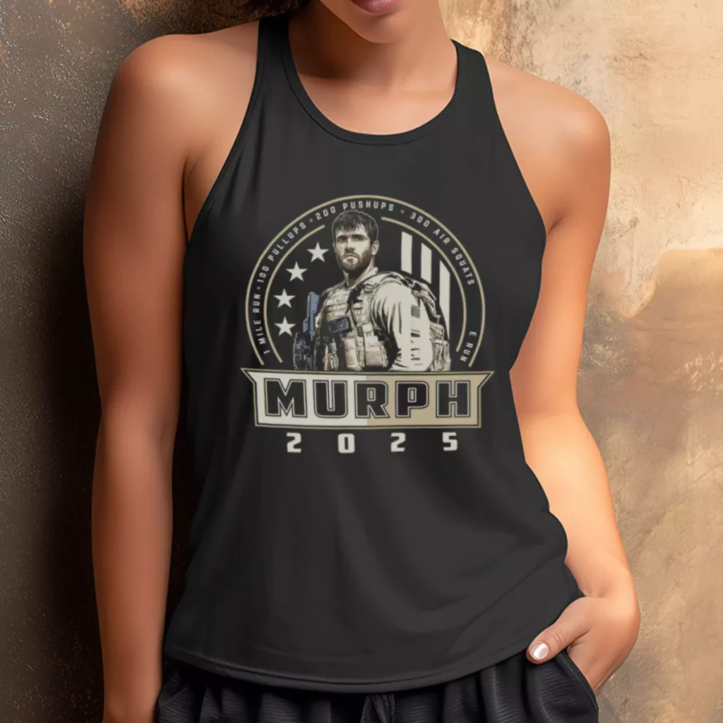 Printed on a black racerback tank, the front centers a circular medallion composition featuring a full upper body soldier portrait with a thin line American flag and stars filling the background of the circle. The full WOD runs in small type along the curved outer border of the medallion: 1 mile run, 100 pullups, 200 pushups, 300 air squats, 1 mile run. A tan banner across the bottom of the circle carries "MURPH" in bold dark type and "2025" sits below in the same spaced tan. The entire composition is rendered in tan, cream, and white against black. The back yoke carries the Copper Valley Strength octopus kettlebell logo in the same desert tan, small and centered. The challenge coin format is a design language that carries immediate meaning for anyone with military or veteran community connections, and it translates perfectly onto a racerback tank built for the workout. These murph tshirts look like something issued, not ordered.