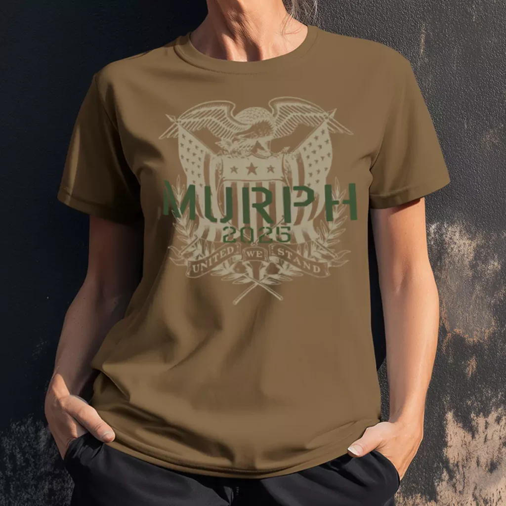 Printed on a coyote brown tee, the front centers a large detailed crest illustration featuring a bald eagle with wings spread over two crossed American flags, flanked by laurel branches, five stars, crossed rifles at the base, and a scroll reading "United We Stand." "MURPH" runs across the middle of the crest in forest green stencil type with "2025" below it in the same green, the only two colors that break from the cream and tan of the illustration. The back carries the Copper Valley Strength octopus kettlebell logo in matching tan at the upper yoke, tone on tone. The crest style draws from 19th century American heraldry and military insignia, a design era that carries real historical weight and fits the Murph tribute naturally. These murph tshirts have more visual detail than anything else in the portfolio and it is all in service of the occasion.