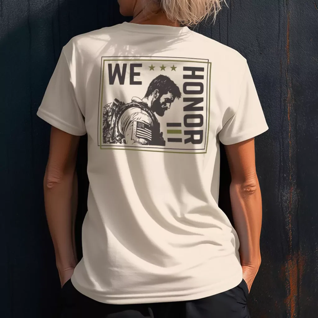 Printed on a natural white tee, the back centers a framed portrait composition with a thin olive green border rectangle containing the soldier illustration. "WE" sits bold in the upper left, "HONOR" runs vertically along the right edge in the same dark charcoal, three olive stars sit across the top, and two small olive green bar details accent the "HONOR" text. The soldier portrait inside the frame is rendered in greyscale with soft detail, head bowed, American flag patch visible on the arm. The front left chest carries the Courage Community Fitness lion badge logo in charcoal grey on white, clean and sharp. The framed composition is the design choice that sets this apart from every other Murph portrait shirt in the portfolio. It treats the illustration like a photograph worth framing, not a graphic element to build around. White is a bold garment call for Murph and it pays off here because it gives the charcoal and olive palette maximum presence without any visual competition. These murph tshirts were made to be kept.