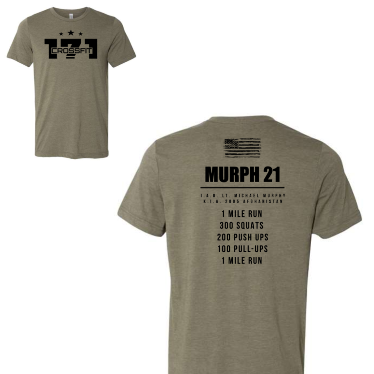 Printed in black on military olive. The front puts the "171" numerals large with "CROSSFIT" locked inside the letterforms and three stars sitting above — bold, structured, no color needed. The back runs the same dedication layout: distressed flag, "MURPH 21," the K.I.A. line, and the full workout listed clean and centered. Black ink on olive gives it a subdued weight that the light blue version doesn't have. Both are right. They just say it differently.