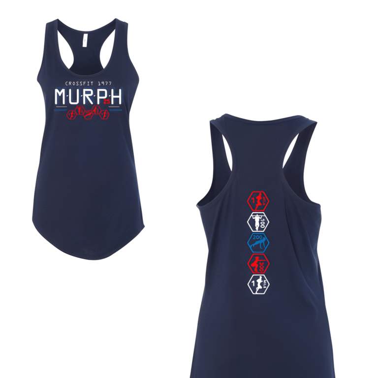 Printed on a navy racerback tank, the front carries a bold "MURPH" wordmark with the gym name arched above it and red, white, and blue hexagon movement icons running underneath. The hex shape brings a tactical structure to the layout without relying on worn out military motifs. On the back, five stacked hexagons each call out a single movement and its rep count in a vertical column, part workout guide, part reminder of what just happened. The racerback cut makes sense here since it breathes well and was built for the female athlete these crossfit shirts are designed for.