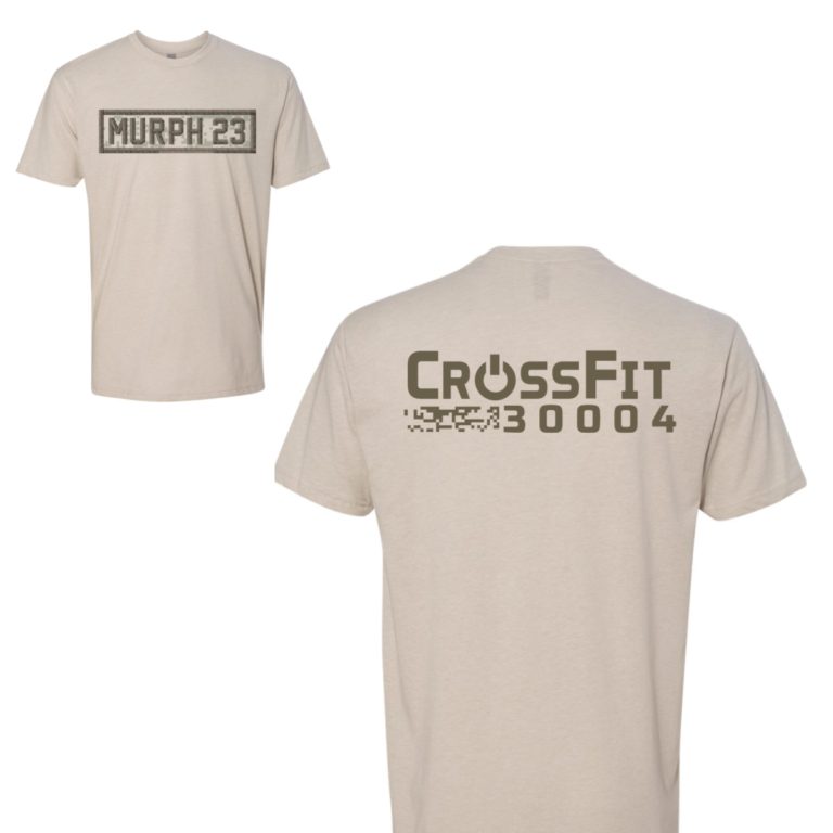 Single olive ink on a natural sand tee — tone on tone throughout. The front runs "MURPH 23" inside a camo filled rectangular patch frame, subtle enough to miss from a distance. The back carries the gym name large with a power button icon replacing the O and a pixel barcode graphic running beneath the numbers. No flag, no portrait, no military imagery. Just the gym identity and a design language that knows what it is doing.