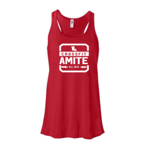 Single white ink on a military olive tee. The front carries the gym name in a bold two-line wordmark — "CROSSFIT" locked inside a filled white bar, "AMITE" large below it, full chest width. The back fills the panel with a heavily distressed vertical American flag, "MURPH 2022" running vertically along the right edge in the same worn white type. White on olive is a combination that does not need anything else added to it.
