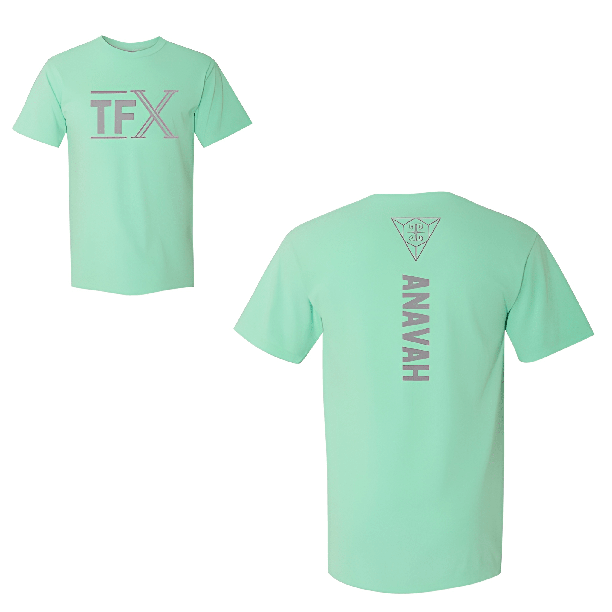 We placed TFX bold above the Anavah name with dark grey ink on a green tee for a clean competition look. The tee was chosen for its comfortable fit and standout color. Centered chest placement keeps the event and gym name front and center.