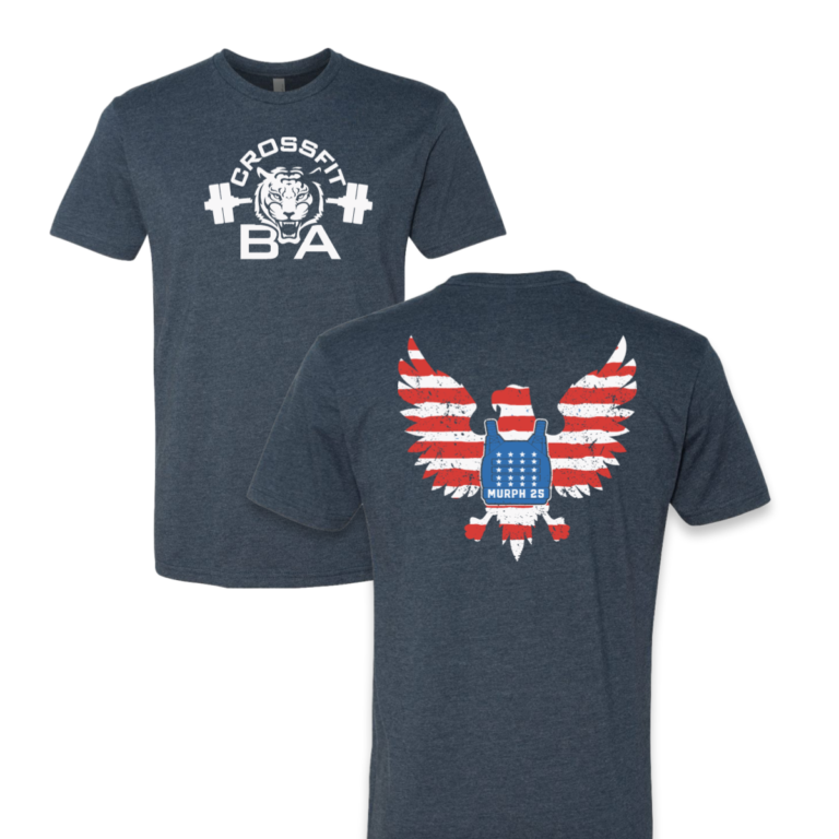 Printed on a heather navy tee, the back graphic features a large distressed eagle built from red and white flag stripes with a blue weighted vest centered in the middle stamped with "MURPH 25." The weathered flag treatment gives it a worn patriotic feel that reads intentional, not decorative. The front carries the CrossFit BA tiger logo in white, keeping the gym identity clean. Standard front chest and full back placement let both graphics do their job without competing.