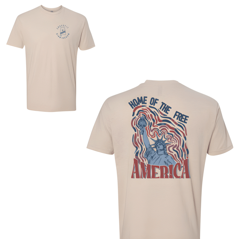 Printed on a natural sand tee, the back graphic centers on the Statue of Liberty surrounded by flowing red and navy wave lines that fill the whole design with movement and energy. The lettering carries a retro Americana feel with bold navy text arching across the top and chunky red type spelling out "AMERICA" across the bottom. The soft heathered garment gives the whole thing a worn in vintage look that fits the design perfectly. A simple gym logo printed on the front left chest keeps the identity clean without competing with the back.