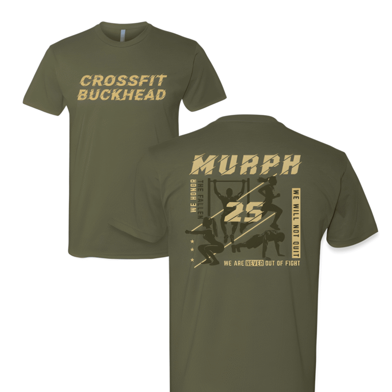 This crossfit shirt is built to feel earned, not purchased. The olive green garment and sand gold ink work together naturally, and the athlete silhouettes give it energy without taking away from the tribute. Members who finish Murph in this will want to keep it around for a long time, which is the whole point of a good Murph t-shirt.