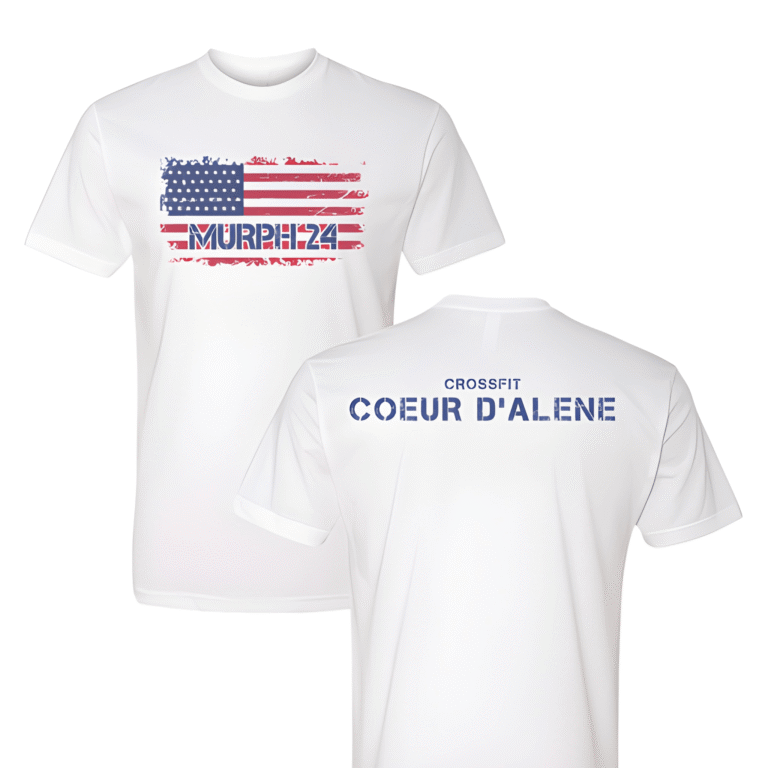 The front carries a full-chest distressed American flag in red and blue on a white tee, with "MURPH 24" set in bold type across the stripes. The worn, battle-aged texture gives it real weight without being loud about it. The back keeps things simple: the gym name in stencil-style navy at mid-back, nothing more. White was the right garment call here. It lets the flag do its job and makes the whole thing easy to wear long past Memorial Day.
