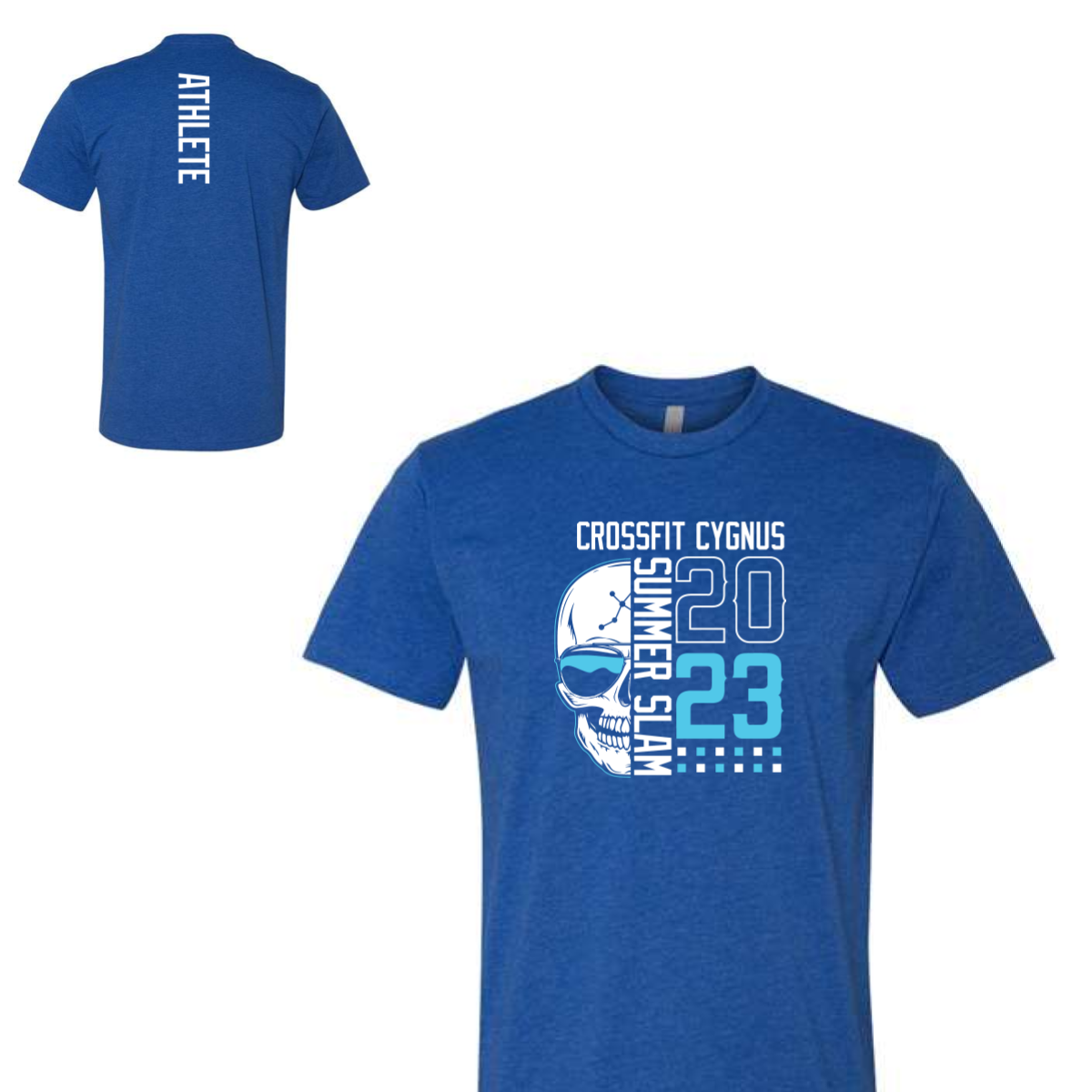 We used a bright blue tee for a strong and active feel. The front design featured a skull graphic with bold type for summer slam 2023. Clean white and blue tones kept the look sharp and modern. The layout stacked the elements for impact. The back added a vertical athlete mark for identity.
