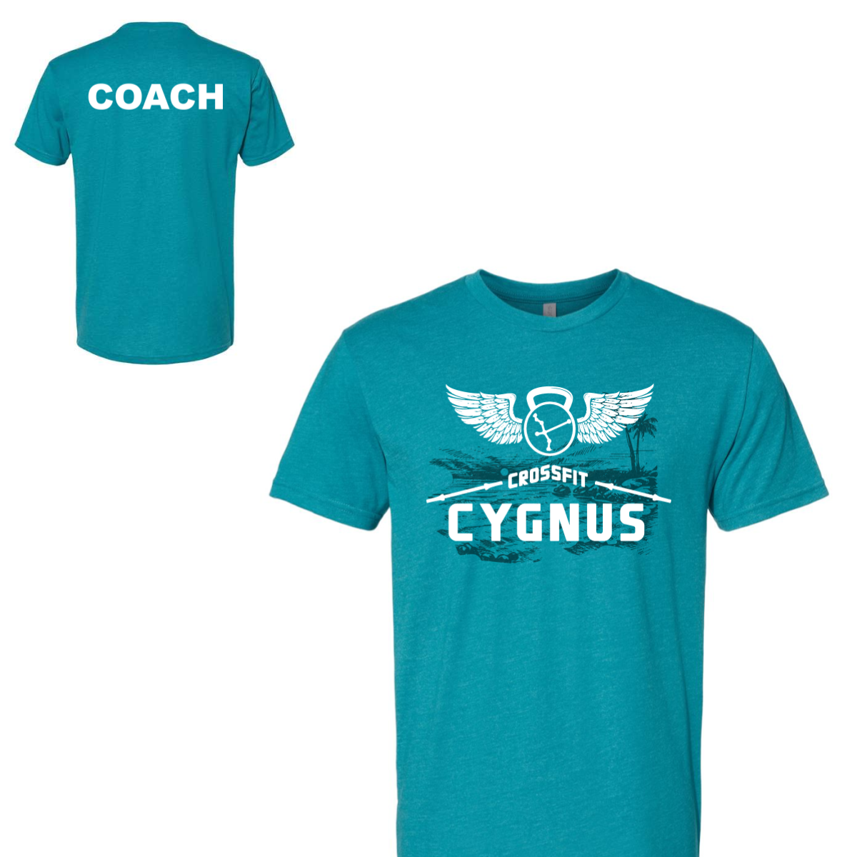 We used a bright teal shirt for high visibility in the gym. The front design featured a winged kettlebell with a coastal scene for a bold and unique look. Clean white ink kept the design sharp and easy to read. The back added a large coach print for clear identification. The layout balanced style with function.