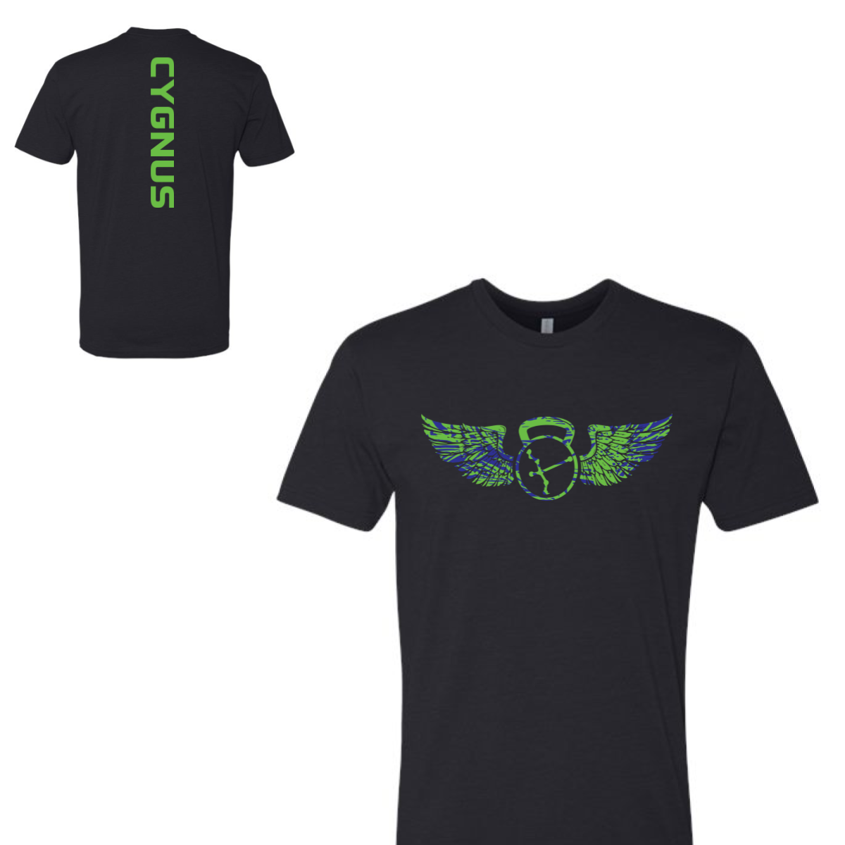 We used a black shirt for a strong base that works in any setting. The front kept it simple with a bold winged kettlebell graphic in bright green and blue. The back added a vertical Cygnus print for a modern and easy to spot detail. The color contrast made the design pop without adding clutter. The layout stayed clean and focused.