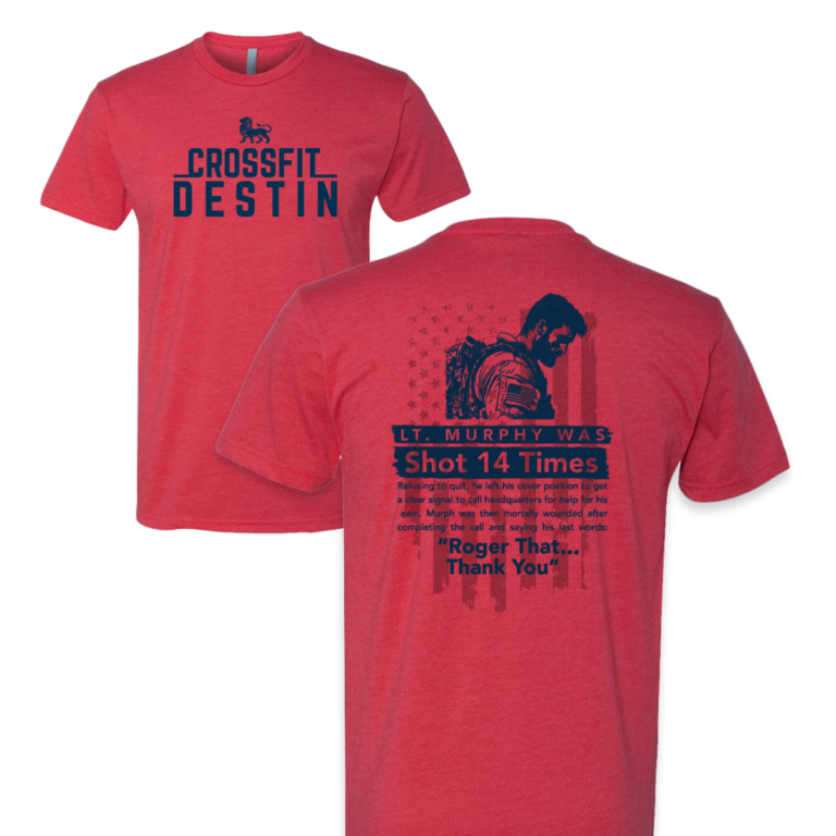 Printed on a heather red tee in navy ink, the back design leads with a portrait of Lt. Murphy in full gear set against a faded American flag. Bold type calls out the number 14 and his final words close it out. The front carries the CrossFit Destin lion logo and gym name stacked clean. Red, white, and navy does the heavy lifting on color, and the full back canvas gives the story room to breathe on these crossfit shirts.