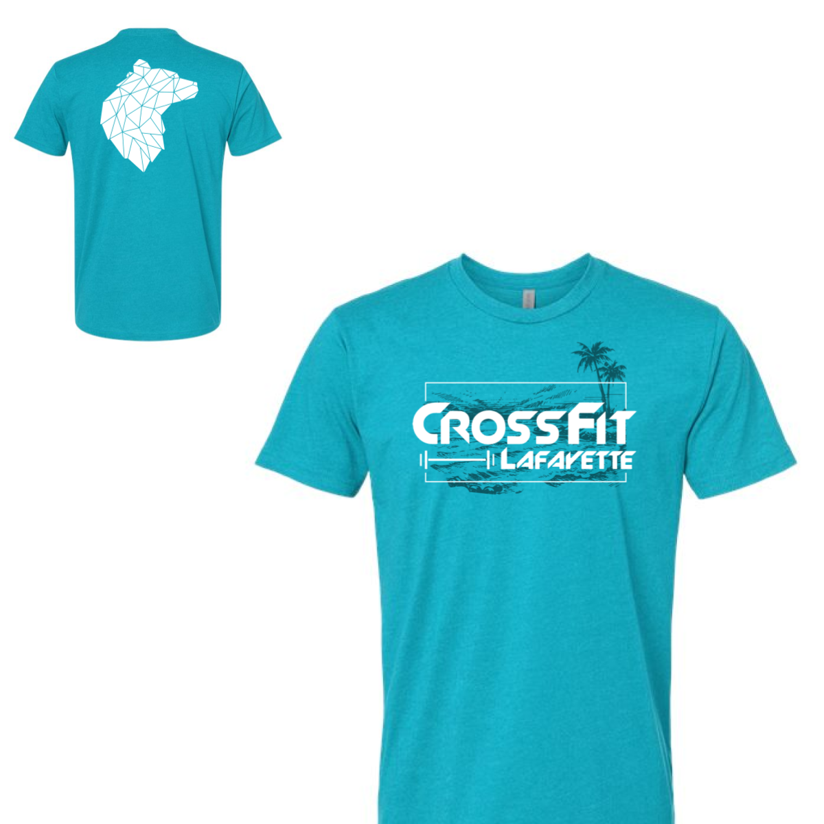 We used a bright teal tee to match the beach theme. The front design framed the CrossFit Lafayette name with a light coastal scene behind it. The thin line box kept the layout sharp and modern. A geometric wolf graphic was added on the upper back for a bold secondary hit. The print stayed minimal and clean.