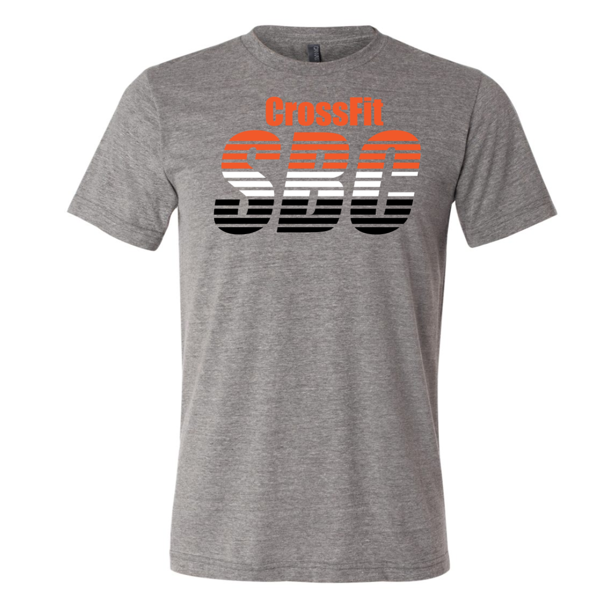 We used a soft grey tee for a neutral base. The front featured CrossFit above large SBC letters. The letters used horizontal stripes to create motion and depth. Bright orange, white, and black gave strong contrast on the grey. The layout stayed centered and easy to read.