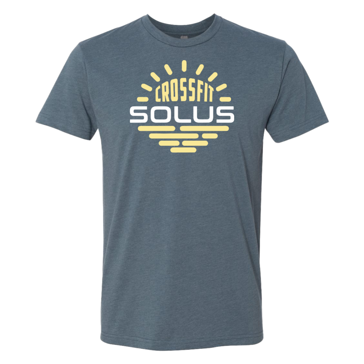 We used a soft slate blue tee for a calm base. The front showed CrossFit Solus inside a sun shape. Yellow rays and lines built a clean sunrise feel. White type kept the name easy to read. The design stayed centered and balanced.