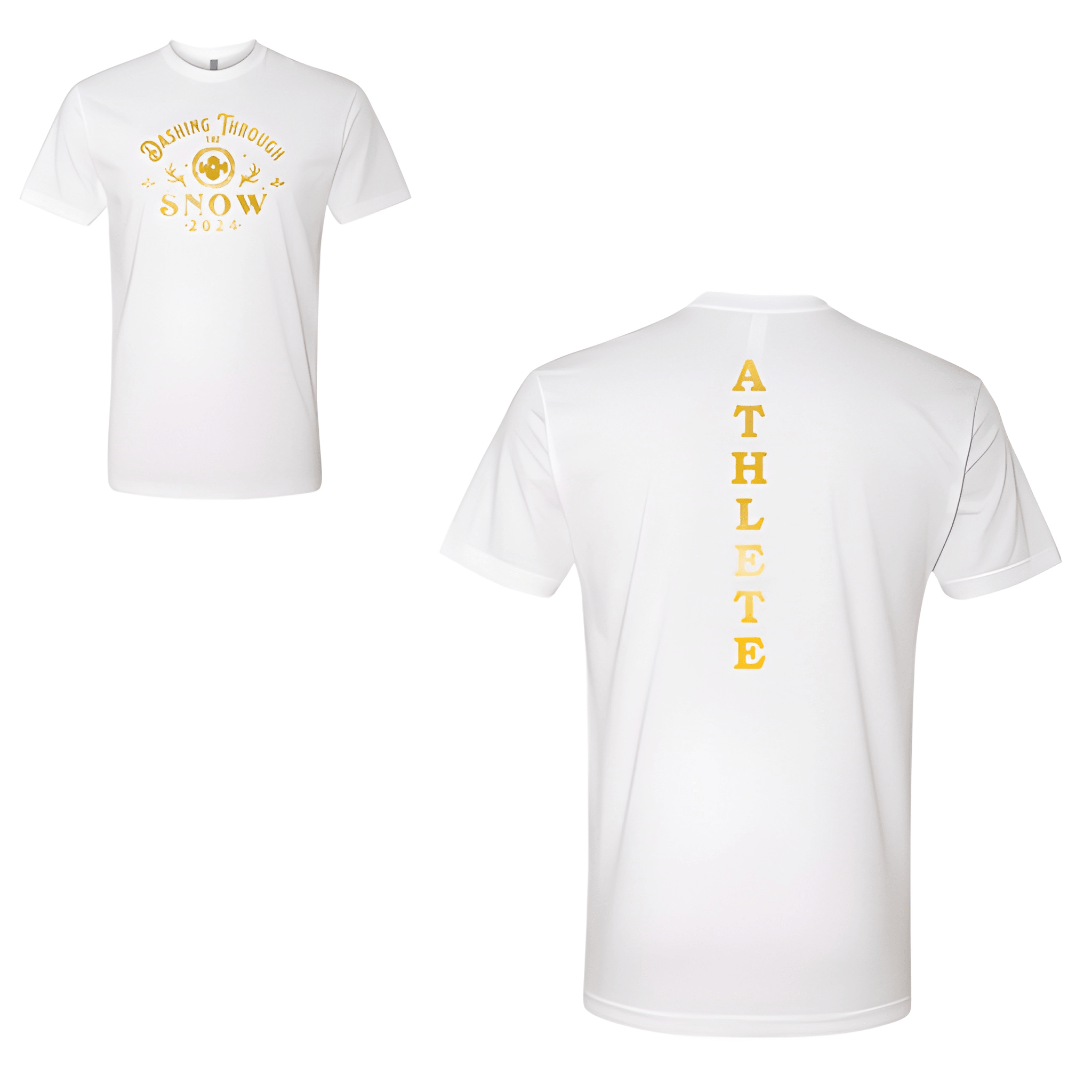 We placed Athlete bold in metallic gold screenprint for a clean festive competition look. The tee was chosen for its comfortable fit and holiday event energy. Centered chest placement keeps the role front and center.