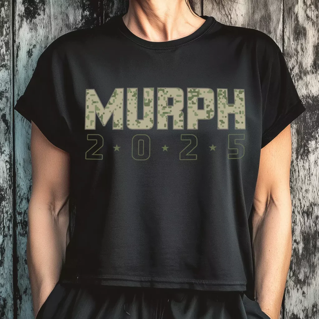 The star-separated year treatment is a small design decision that carries real weight — it reads like a timestamp on a military document more than a calendar year on a gym shirt. The digital camo fill on a black base is a proven combination that holds up across lighting and washes. These Murph tshirts are built for gyms that want a women's specific option with a more modern silhouette without giving up any of the seriousness the day calls for.