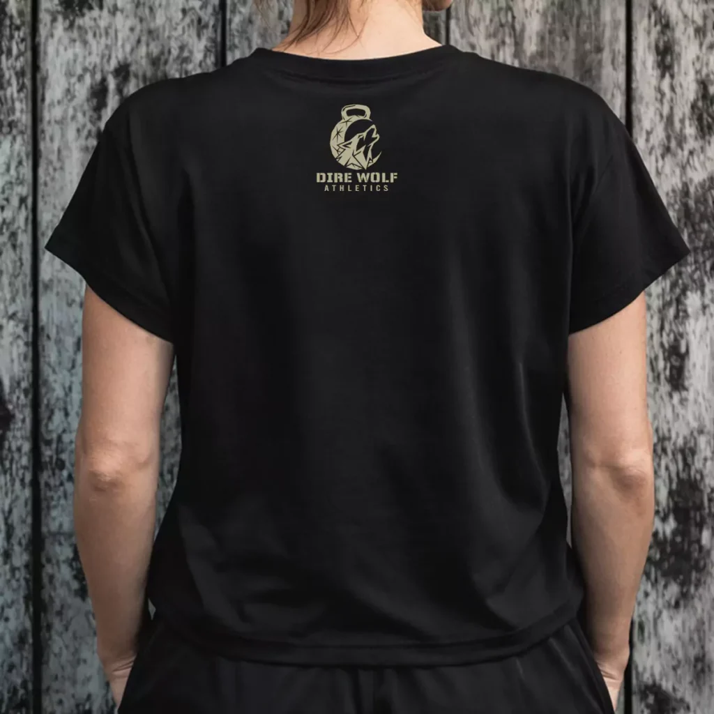 Printed on a black cropped performance tee, the front graphic sets "MURPH" in wide collegiate block letters filled with a classic ACU-style digital camo pattern in sage green and tan on a darker olive base. Below the word, the year reads as "2 • 0 • 2 • 5" with small stars separating each digit — a subtle detail that slows the eye down and adds a quiet ceremonial quality to what could have been a plain year stamp. The Dire Wolf Athletics kettlebell wolf logo prints in muted olive gold at the upper back neckline with the gym name stacked below in clean spaced caps. The cropped silhouette is a deliberate garment choice that sets this apart from standard unisex gym shirts in the same camo family.