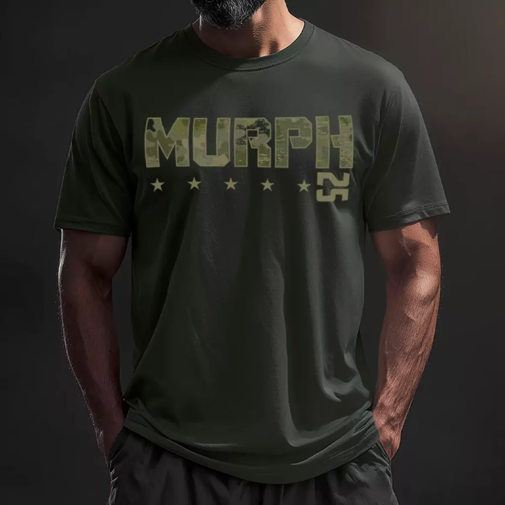 Printed on a military green performance tee, the front centers "MURPH" in large block letters filled with a multi-tone woodland camo pattern in olive, tan, and dark green. Five small stars and a stacked "25" in matching camo sit below the text, everything rendered in the same earth tones as the garment itself. The back carries the Dire Wolf Athletics wolf kettlebell logo centered at the upper yoke, tone on tone in the same olive green, barely visible unless the light hits it right. The all-green palette is the whole concept. Garment color, camo fill, logo, stars all living in the same family of military green. There is not a single contrast color on these murph tshirts anywhere and that is what makes them work. They feel like they were issued, not designed.
