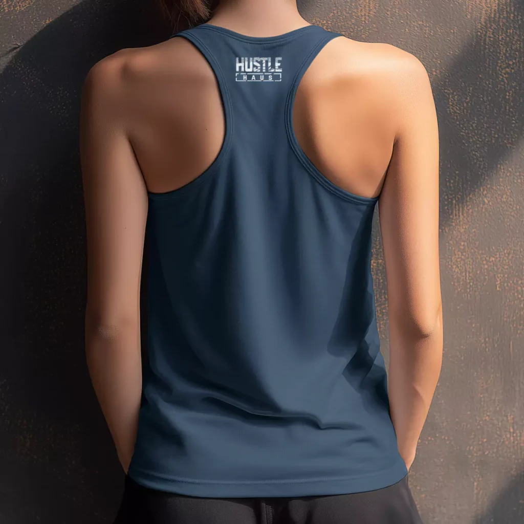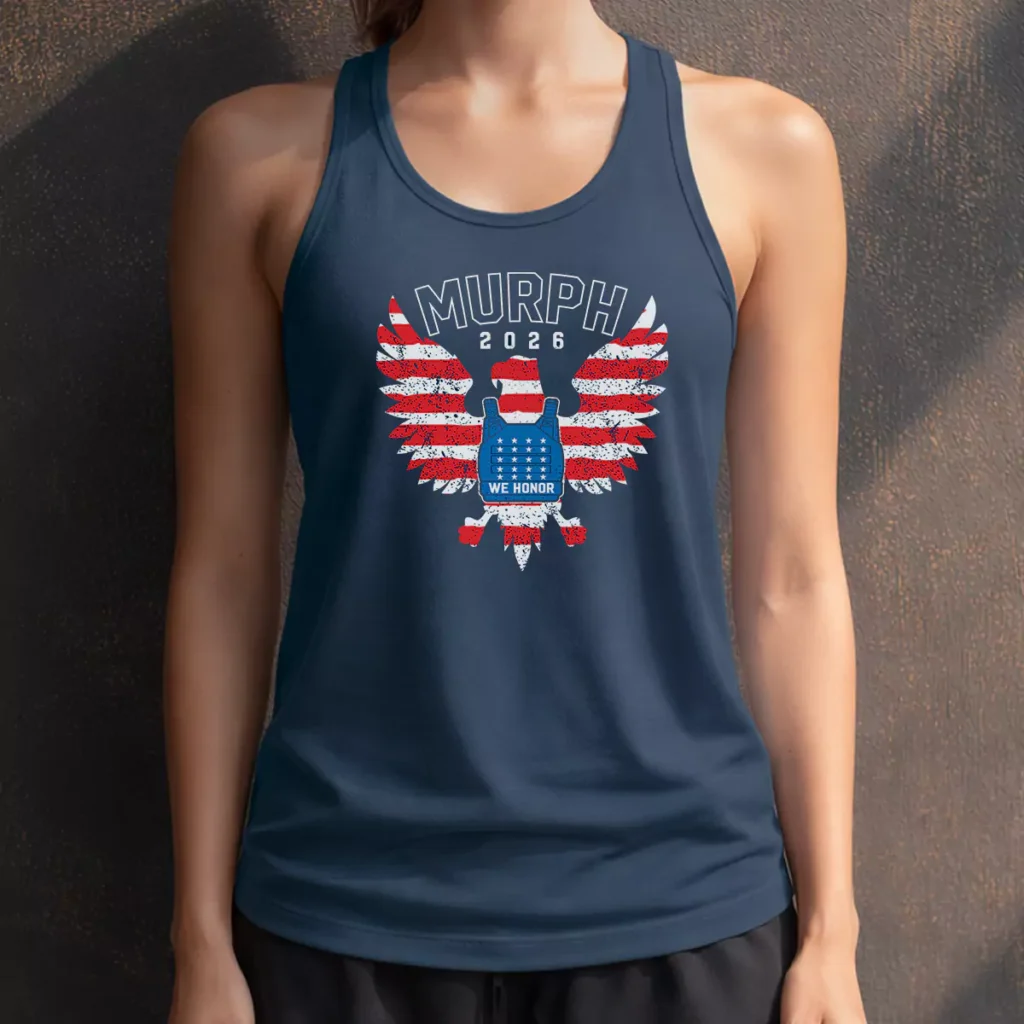 Printed on a navy racerback performance tank, the front centers a large distressed eagle wing graphic built entirely from American flag stripes and stars in red, white, and blue. A weighted vest sits at the center of the wingspan — a direct nod to the full Murph — with "We Honor" on a banner across it. "MURPH" arches over the top in white collegiate type with "2026" below it. The Hustle Haus wordmark prints in white on the upper back. The distressed texture treatment keeps the patriotic palette from feeling too polished — it's worn in, like the workout itself.