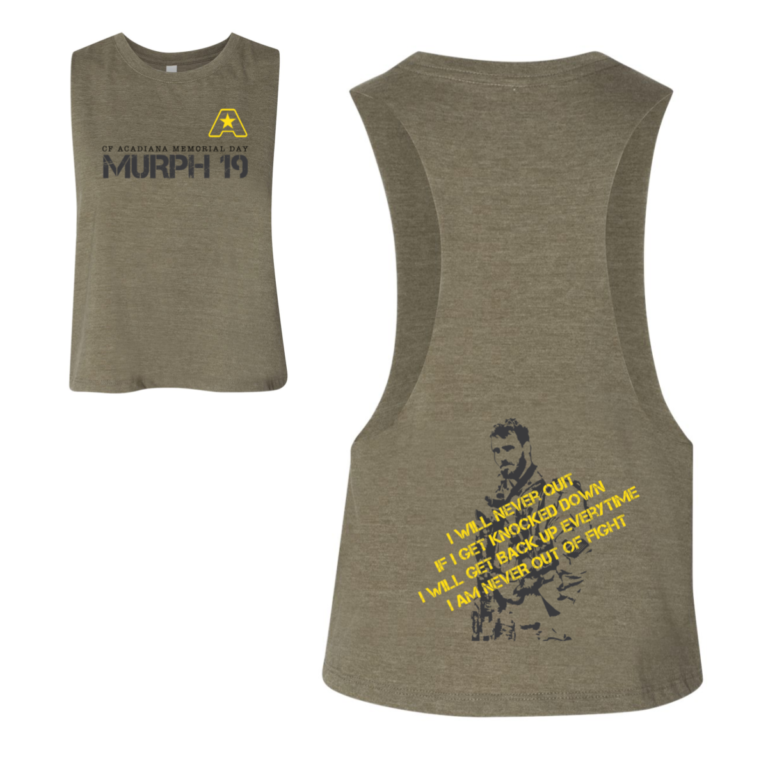 Offering the same graphic on both a tee and a muscle tank lets the community choose how they want to carry the tribute. The tank version has a rawness to it that fits Murph specifically. These are the gym shirts built to be worn while doing the thing they reference, and the olive garment makes that connection impossible to miss.