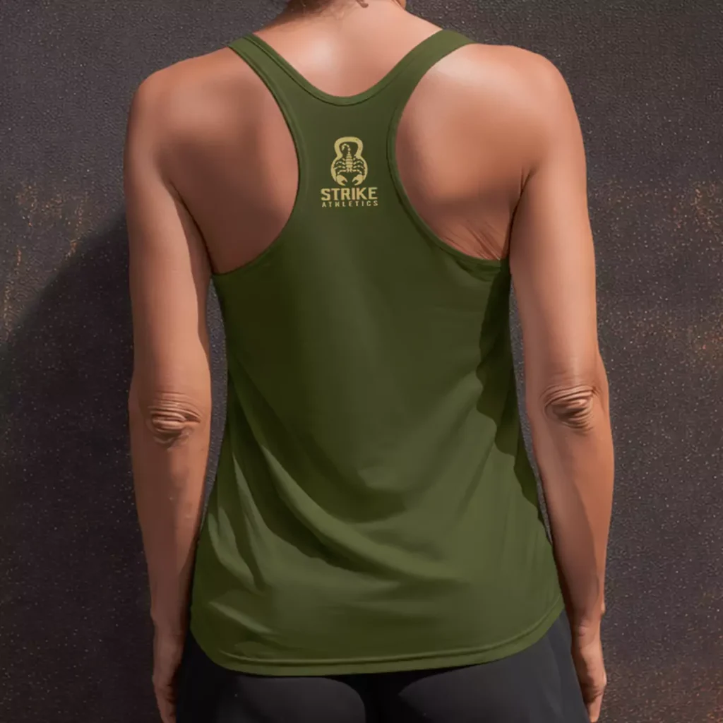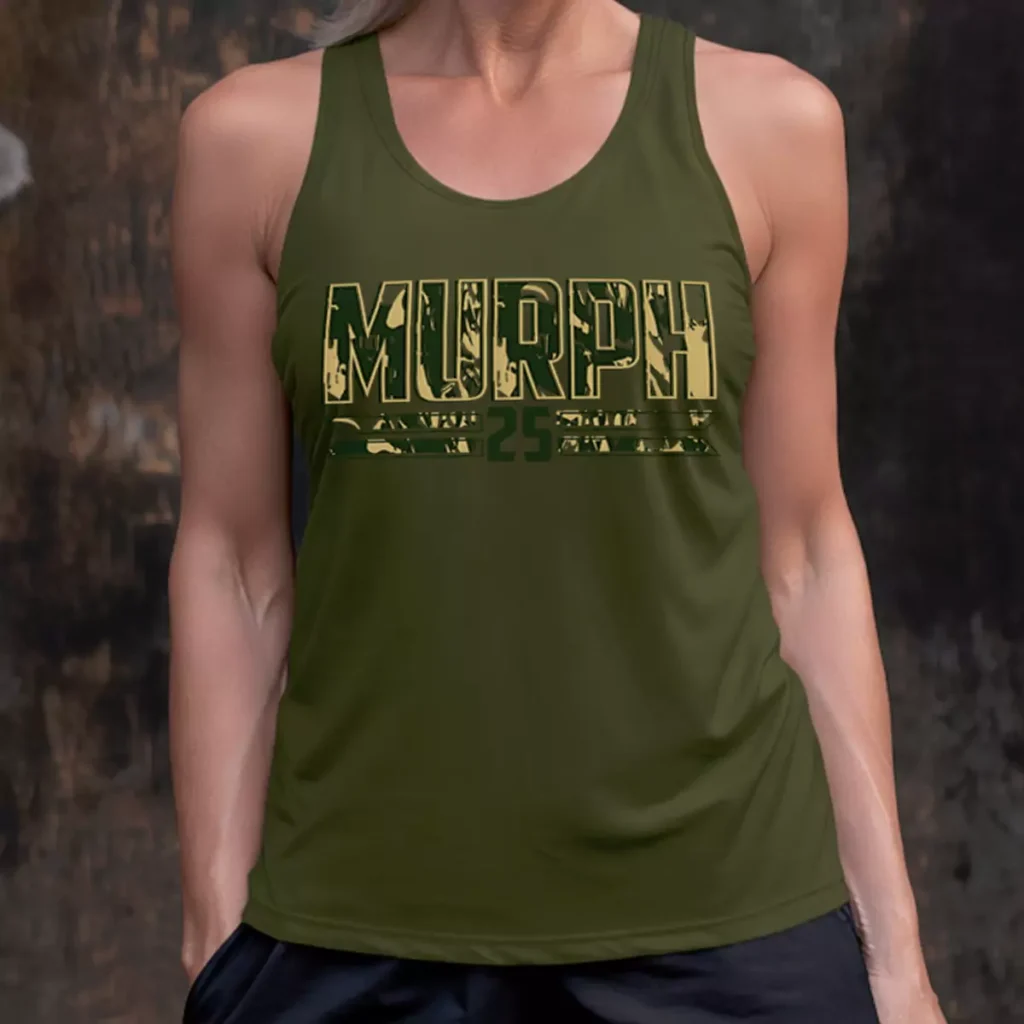 The gold and olive pairing is one of the stronger color combinations in this portfolio — the warmth of the gold pulls the imagery inside the letters forward without needing any white or bright contrast. It feels like a field decoration rather than a gym graphic. These Murph tshirts give Strike Athletics members something that reads as intentional from every angle, and the racerback cut means the shirt actually gets worn well past Memorial Day weekend.