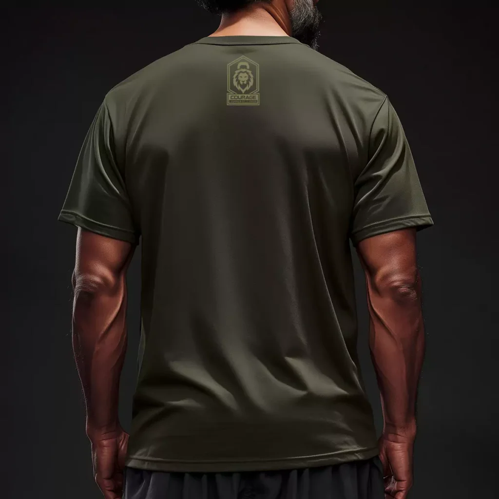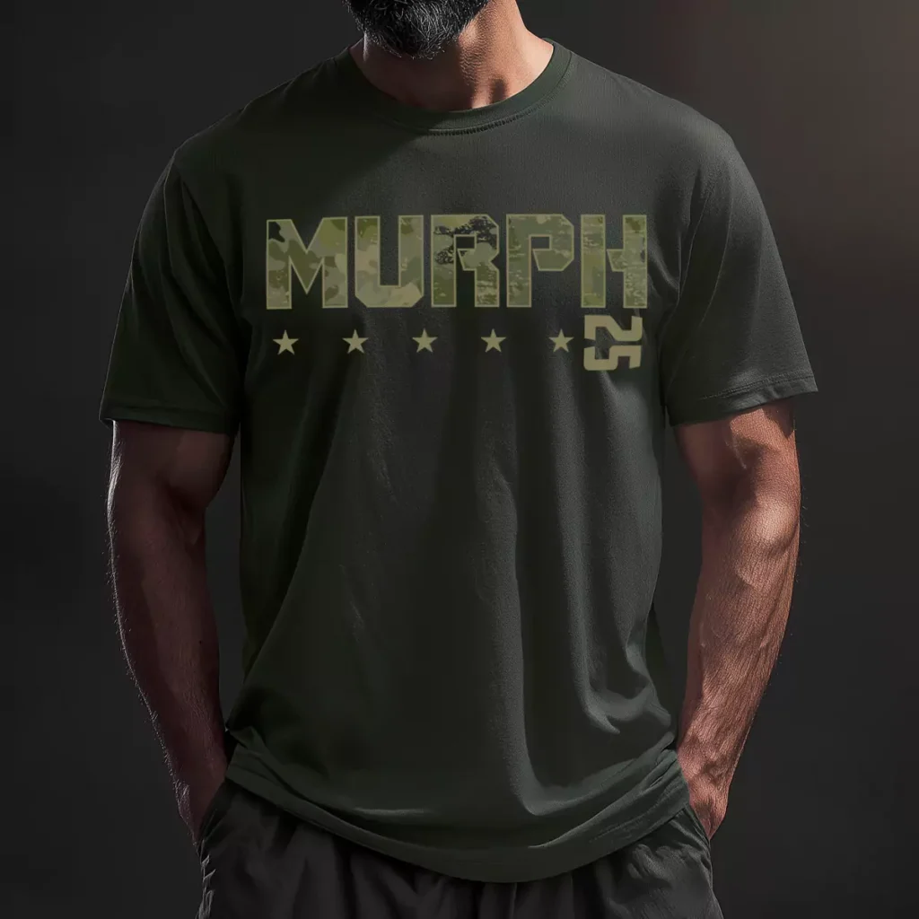 The five-star row gives this design a military rank feel that fits Murph better than most decorative elements would. Nothing here is accidental — the stars, the camo, the olive base all point in the same direction. These Murph tshirts are built for a gym that takes the day seriously and wants their members wearing something that reflects that. The all-tonal treatment also means these gym shirts hold up well long after Memorial Day is over.