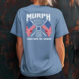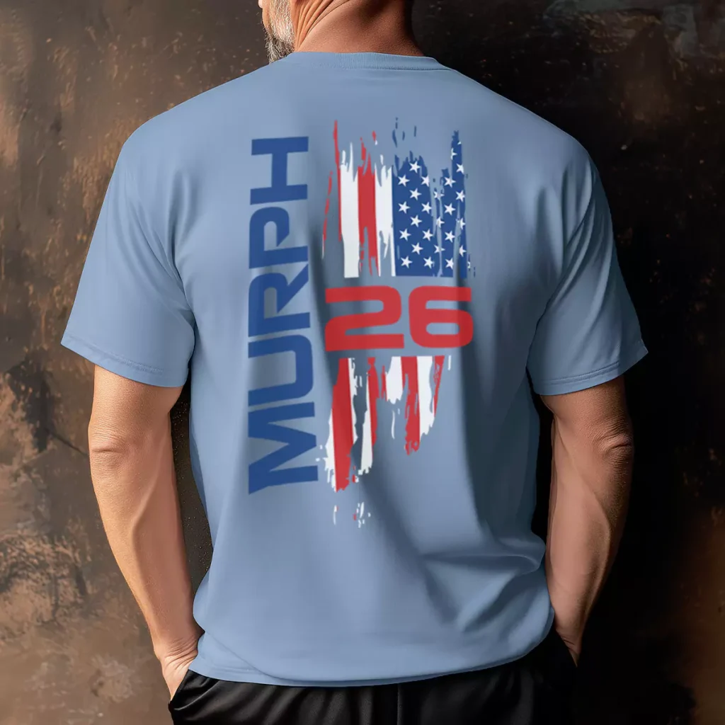 This is the same gym running the same vertical logo format on two different shirt colors, which shows a gym that knows their identity and builds on it year to year. The light blue version softens nothing — it just shifts the mood from tactical to athletic. Red against sky blue is a combination that carries its own energy and these Murph tshirts wear that energy well. A strong color option for gyms that want to offer variety across their Murph apparel run.