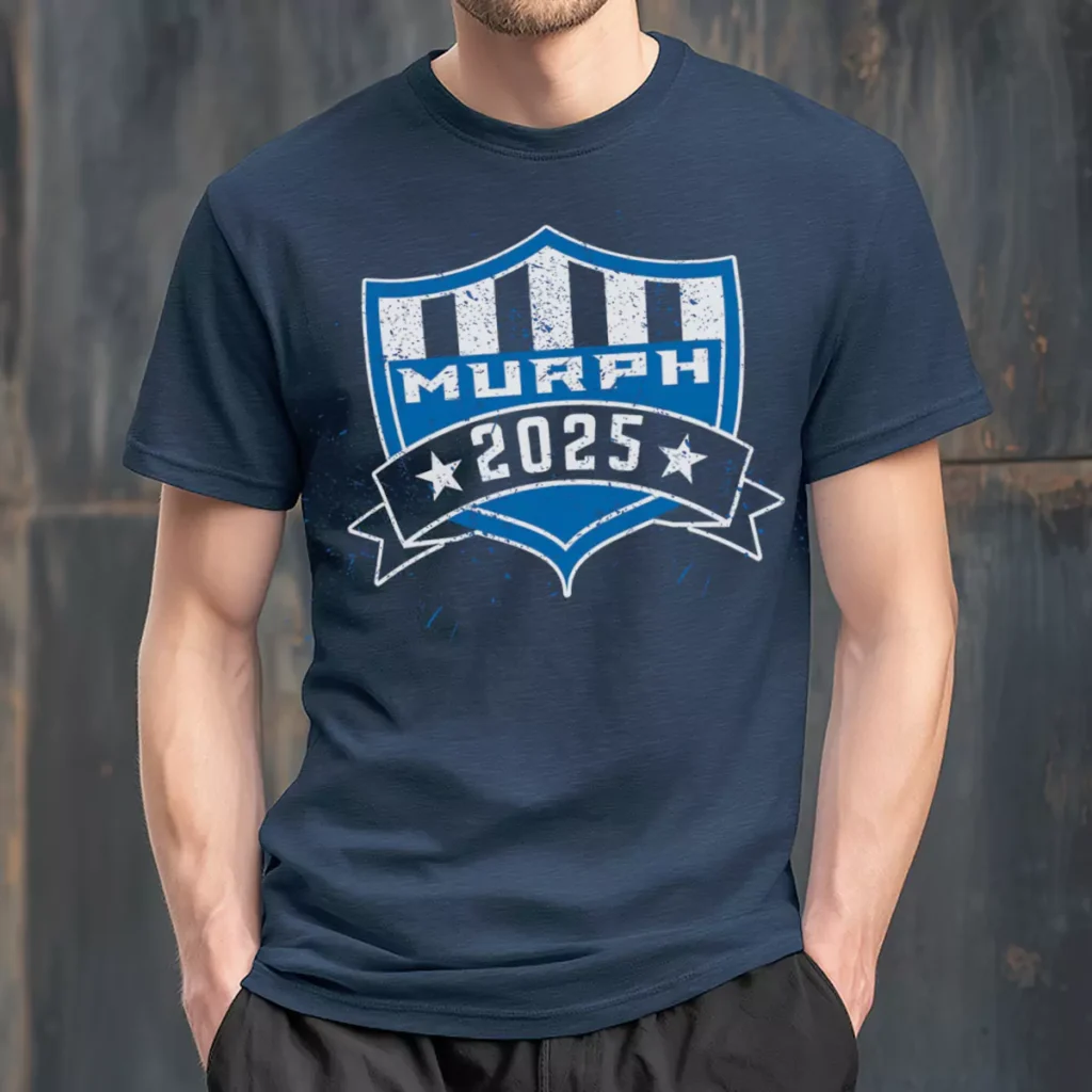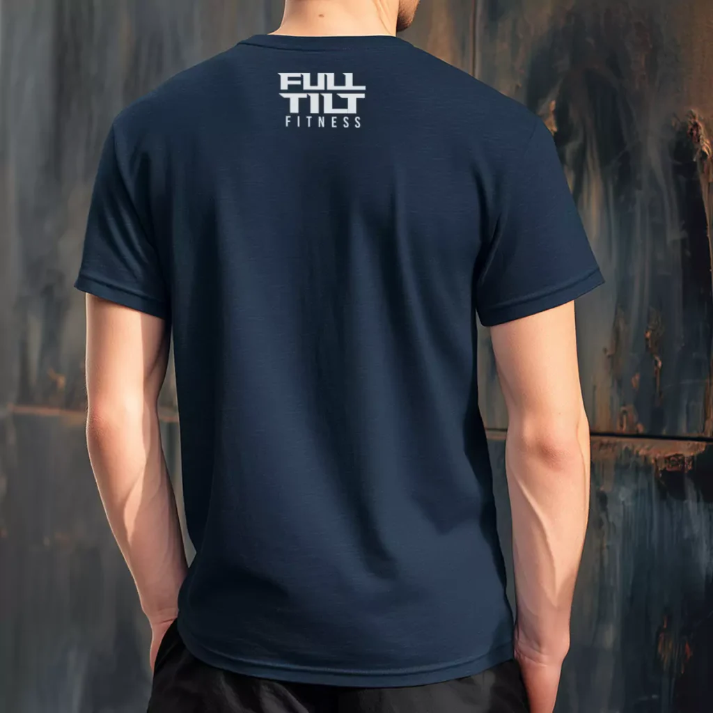 Printed on a navy tee, the front centers a large distressed military shield emblem in royal blue and white. Pull bars fill the top of the shield, "MURPH" sits bold across the middle, and a scroll banner with "2025" flanked by stars finishes the bottom. The whole piece is aged with a heavy splatter distress that keeps it from looking corporate. The back carries the Full Tilt Fitness logo in white at the upper yoke, clean and compact. The shield format is a direct nod to unit insignia and challenge coins, which gives these murph tshirts a visual language that resonates with anyone who has served. Navy on navy with a blue and white emblem keeps the palette intentional without going loud.
