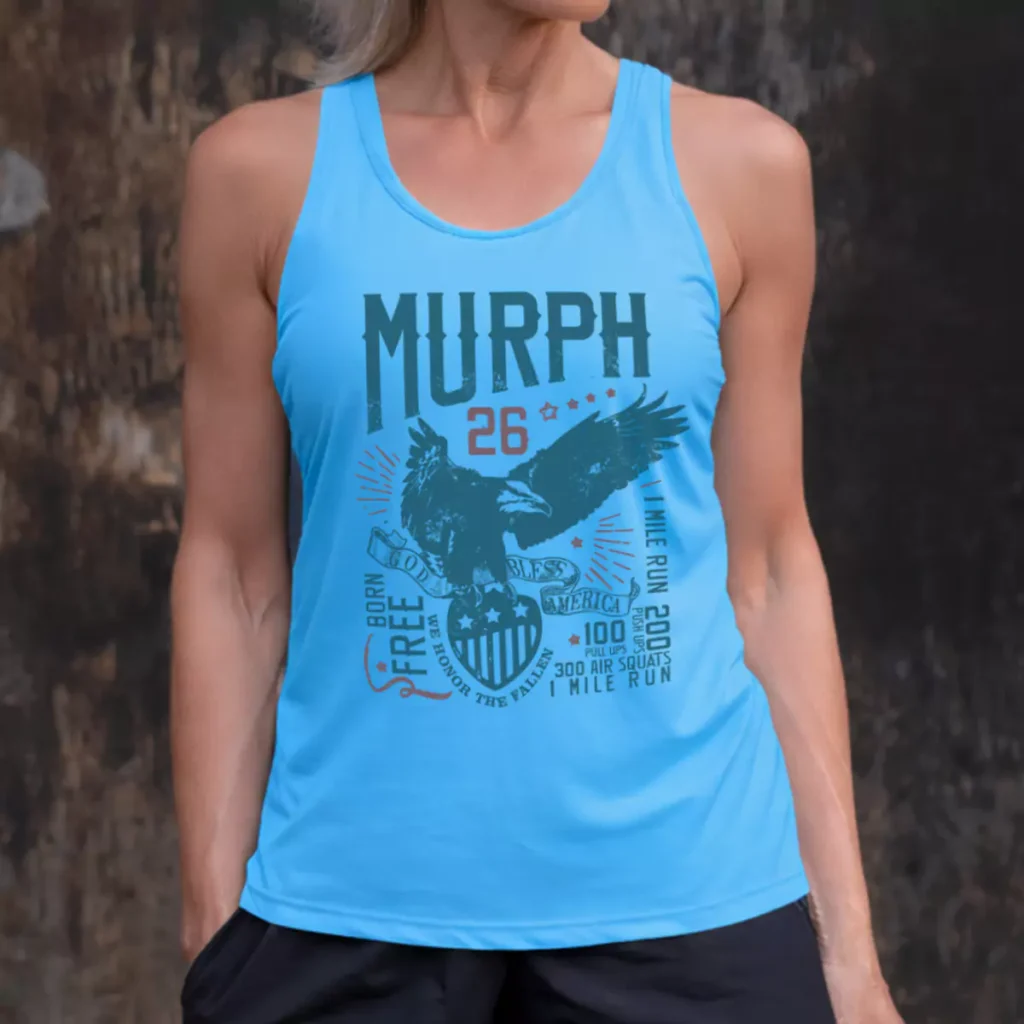 Printed on a bright sky blue racerback performance tank, the front is a dense vintage-style composition — a large diving eagle carrying a shield with stars and stripes, banner ribbons reading "Born Free," "God Bless America," and "We Honor the Fallen," the full workout listed on the right side, and "MURPH 26" anchoring the top in dark teal and red. Starburst accents and small stars fill the negative space. The Firebolt Strength flame logo prints tone-on-tone in teal on the upper back. The sky blue base is an unexpected choice that makes the dark ink feel fresh instead of heavy.