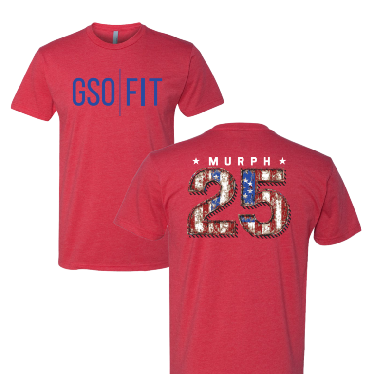 The back centers a bold "25" filled with a distressed American flag texture and trimmed with a stitched shadow outline. "MURPH" sits above it flanked by stars in clean white lettering. Everything is printed on a heather red tee, and the front carries the GSO Fit logo in royal blue. The palette is red, white, and blue without beating you over the head with it.